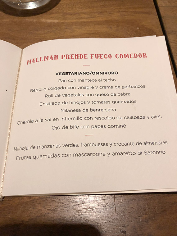 Ensalada de hinojos y tomates quemados, Milanesa de berenjenas, Chernia a la sal en infiernillo de rescoldo de calabaza y alioli, Ojo de bife con papas domino y terminar co Milhojas de manzanas verdes frambuesas y crocante de almendras y frutas quemadas con mascarpone amaretto si Saronno.