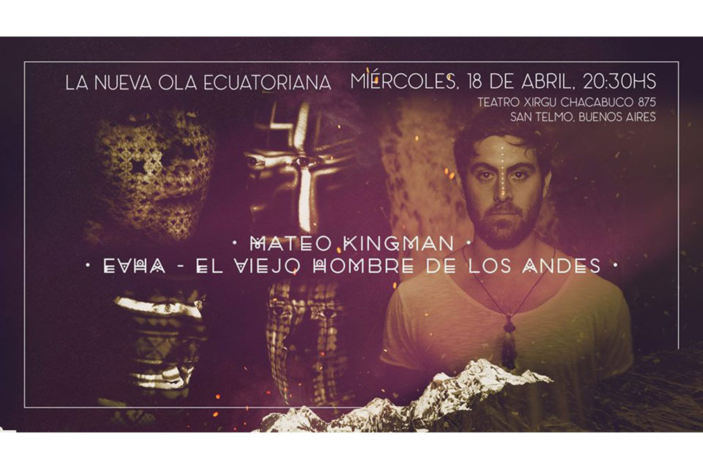 El miercoles 18 de abril la nueva ola de música nueva Ecuatoriana desde la Amazonia hasta los Andes – Mateo Kingman & EVHA por la primera vez juntos en Buenos Aires. El solista Mateo Kingsman es la perfecta alquimia de sonidos orgánicos de la música andina, rap, percusión y muy buen uso de la electrónica y buenos coros para hacer danzar a la gente y melodías para elevarse en la pista de baile. Nacido en el pueblo ecuatoriano de Macas casi en el limite con Peru este veintiañero ya ha actuado junto a Calle 13 y Manu Chao. Su disco respira incluye los hits Sendero del monte, Lluvia y Mi Pana junto al rapper Guanaco.