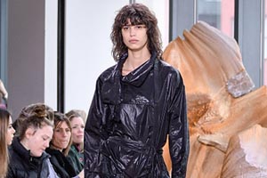 Felipe Oliveira Baptista permite apartarse un poco – un pequeño paso para el hombre pero un salto gigante para su inspiración – y mezcla la estética de la conquista con los códigos «míticos» del grunge y la streetwear de los años 90, ahora clásicos modernos, dando una sacudida a los outfits ultra funcionales y sellándolos en el aquí y ahora. Nueva vida a la camisa de leñador de lana y a los cardigans mohair de gran tamaño que recuerda el estilo usado por Kurt Cobain. Pantalones muy holgados y de inspiración militar, que se deslizan hasta el suelo pero con una cintura elástica; una versión Dandy de los pantalones deportivos. Asociados a chaquetas muy estructuradas y ajustadas, cortan una silueta original y atrevida.