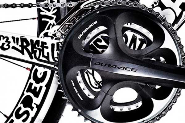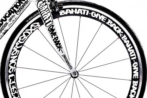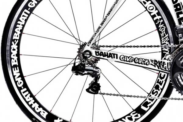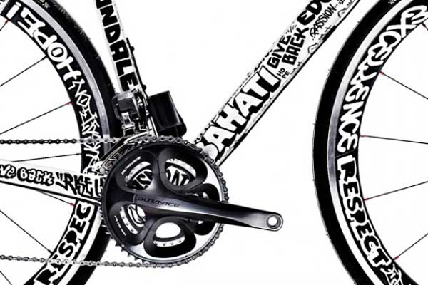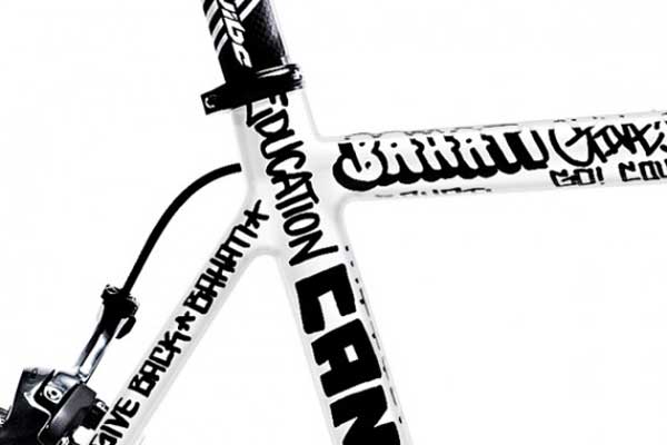 Mike Giant nos encanta. Tatuador excelente, uno de los mejores creadores de fonts y scripts y graffittero eximio, criado entre el punk rock, el skate y el hip hop, con trabajos memorables para Think o Rebel8, se unió al ciclista Rahsaan Bahati, que es como la versión hip hop de Lance Armstrong pero en velódromo y un ciclista muy laureado con premios como el Pro Criterium Championship para su fundación que ayuda a que los chicos de LA dejen la vida gangster. También, Cannondale, uno de los creadores de bicis clave. El resultado: esta bicicleta low única y totalmente Mike Giant, en subasta de caridad en Ebay.
