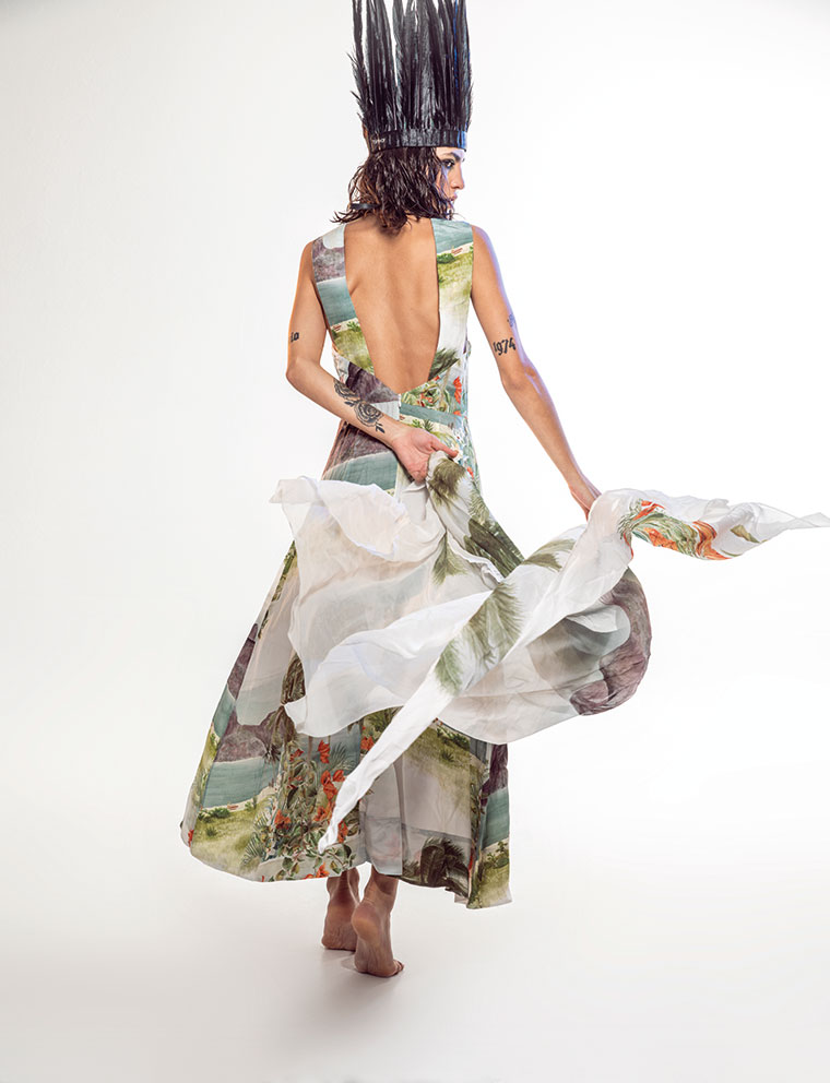Esta vez el cuadro pintado por su hermana del Corcovado y de la Ciudad Maravillosa se transformó en seda y en el print original de su colección Verao 2021.