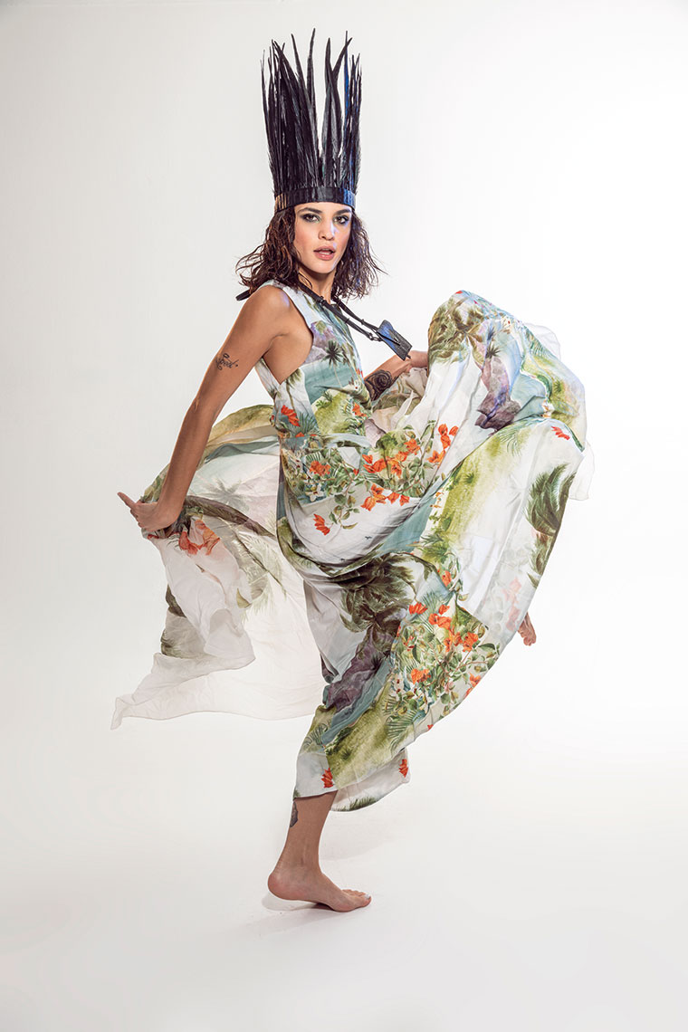 La bella Lu Banchero con plumas remix + foullard de seda RJ Osklen