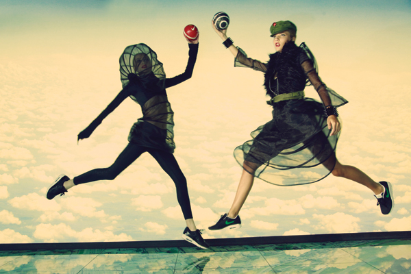 vestido corto de silueta anatómica y bombé, con estructuras semi esféricas de gasa, armadas con ballenas RITA KONIAIEVA leggins y zapatillas NIKE AIR MAX 90
