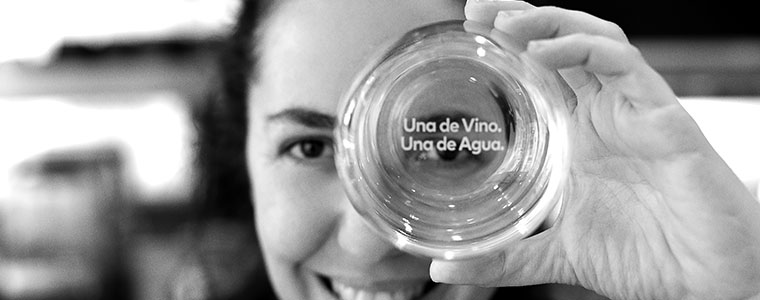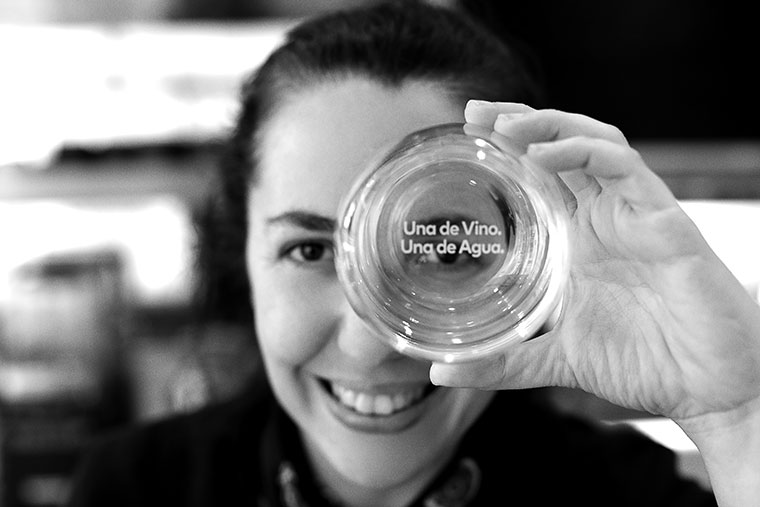 Uno de los vasos del Comedor Narda lleva la frase en su base: “UNA DE VINO. UNA DE AGUA”.