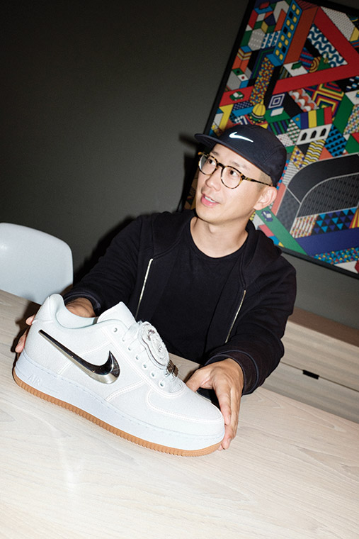 El diseñador y el Senior Creative Director de Nike, Al Baik, junto a las Nike Air Force 1 Low Travis Scott diseñadas x Travis Scott.