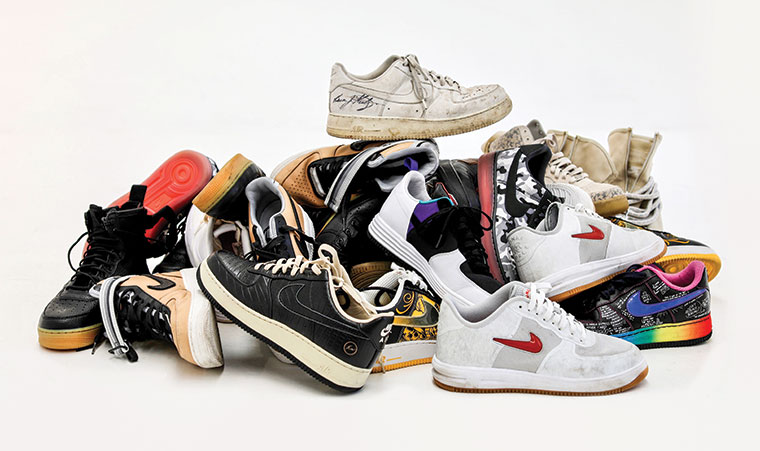 Nuestro editor Tuti Gianakis eligió sus favoritas Air Force 1 de ediciones limitadas. “En mi Top 10 de Air Force 1 favoritas no pueden faltar las originales AF1 07 blancas firmadas por Bruce Kilgore arriba de todas las zapas. Después, de izquierda a derecha, están las Special Force AF1 Mid negras con doble cierre trasero que permite introducir el pie sin desatar los cordones y está inspirado en el calzado militar. Las AF1 son famosas por la suela diseñada hace 35 años por Bruce Kilgore y esta versión del 30 aniversario llamado AF1 XXX Downtown tiene cuerpo camuflado blanco y negro y suela naranja flúo cubierta por una goma traslúcida opaca y sólo se conseguía en la ciudad de Nueva York.