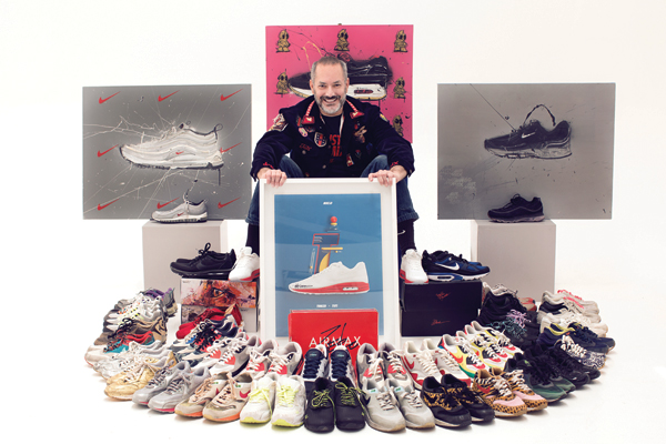Tuti Gianakis, nuestro editor, posa junto a parte de su colección de sus zapatillas Air Max edición limitadas que junta hace 30 años para festejar el #AirMaxDay.