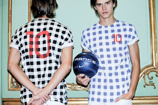 Izquierda: t-shirts blanca con rayas azules Nike FFF, calzas y traje de baño azules Nike FFF, zapatillas Nike dunk blancas y azules y pelota de fútbol Nike FFF Prestige azul francia. Derecha: M65 jacket roja Nike FFF, t-shirts gris a rayas blancas Nike FFF, calzas y traje de baño rojos Nike FFF y zapatillas Nike dunk rojas.