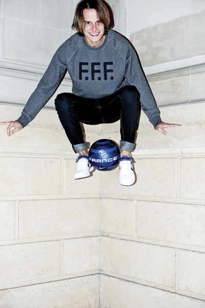 Boina roja Agnes B, pañuelo de seda France Ruby Paris, t-shirt blanca y azul a cuadros 10 Nike FFF, jeans blanco fragment design Levi’s, zapatillas Nike dunk blancas y azules y pelota de fútbol Nike FFF Prestige azul francia.