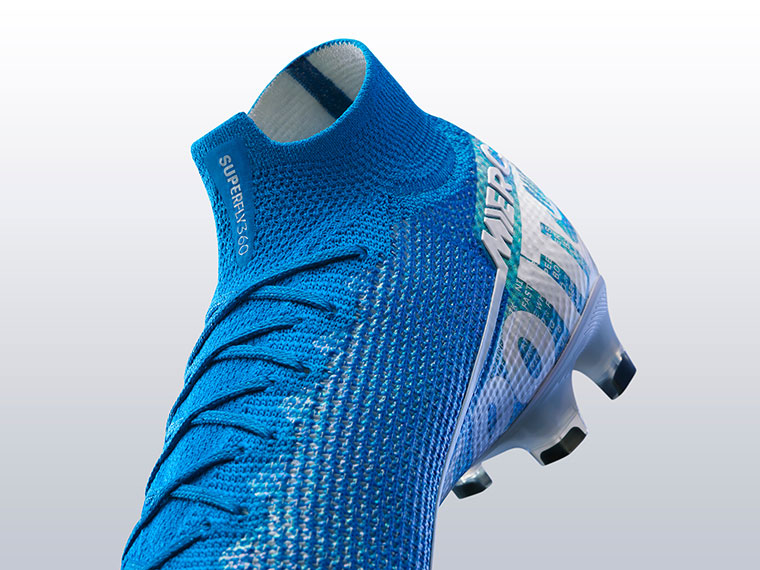 La estructura de la capellada flyknit, confeccionada por un conjunto de hilos, es la más delgada y fuerte desarrollada por Nike Fútbol hasta el momento. Esto reduce la rigidez del material, logrando mayor suavidad y comodidad. Estos hilos -incorporados por primera vez en la historia de Mercurial– son más livianos y fuertes que los convencionales, aumentando la sujeción del pie desde el talón hasta la punta.