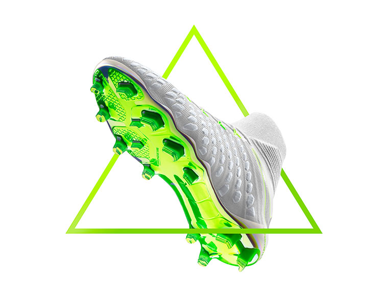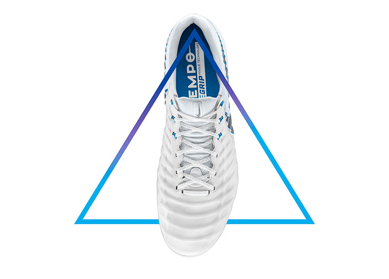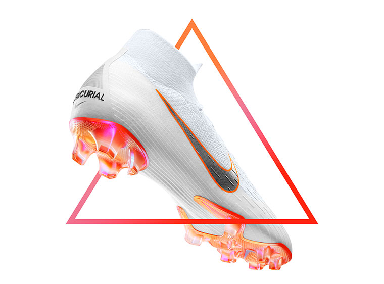 Los botines blancos tienen un swoosh en gris metálico y una placa con los colores característicos de cada uno de los silos: Total Orange (Mercurial 360), Volt (Hypervenom), Bright Crimson (Magista) y Blue Hero (Tiempo).