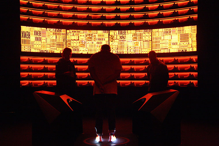 Elegimos la primera pantalla basada en la palabra “remix”, que inmediatamente se proyectó en nuestros pies, y gracias a palabras claves como: “bigger, smaller, color” y hasta “remix” transformaba el diseño, tamaño, color y hasta la tipografía de forma aleatoria del diseño, que no solo se proyectaba en las “llantas” de nuestros pies sino que también se proyectaban en la pantalla enfrente nuestro, mostrando los distintos ángulos de la zapatilla.