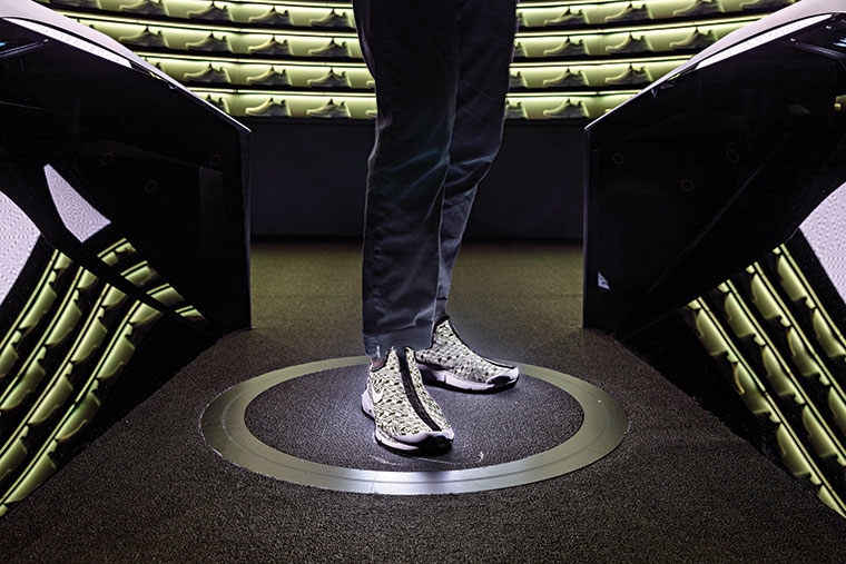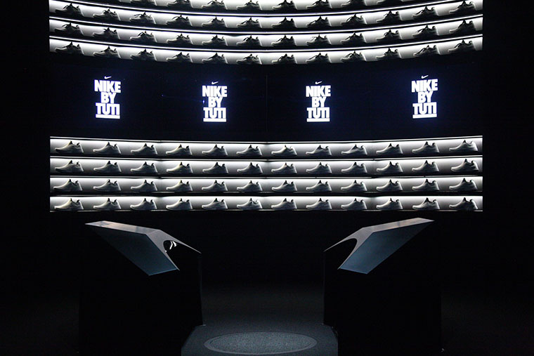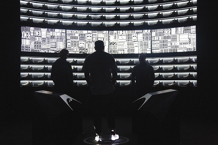 Después de darnos la bienvenida, nos dieron un par de zapatillas Presto X impolutas, exclusivas del Makers Experience, con unos pequeños sensores metálicos que apenas sobresalían de la suela. A pasitos del cómodo sillón, nos invitaron a pararnos en una pequeña plataforma negra rodeada por unas pantallas semi-circulares que replicaban las zapas Presto X blancas, enfrentadas a una inmensa pantalla que proyectaba en la parte superior e inferior varios perfiles de las zapatillas que rotaban, y en el centro había tres diseños digitales para elegir. El primero se basaba en un concepto tipográfico, el segundo era un pseudo-camouflado y el tercero más pop, basado en stickers de distintas formas y tamaños.