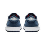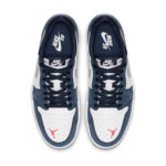 Optando por renunciar a una lengüeta y un cuello acolchados para un look más delgado de estilo OG, los diseñadores han vestido la zapatilla elegante con una combinación de cuero blanco nítido y gamuza azul marino.
