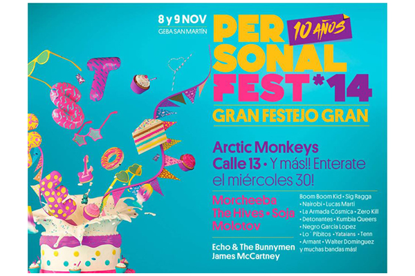 Buenos Aires, 25 de julio: Personal Fest cumple 10 años y lo festeja con una edición especial, que tendrá un line up con los mejores shows internacionales y nacionales  el 8 y 9 de noviembre en el Estadio G.E.B.A San Martin. Con Arctic Monkeys y Calle 13 como headliners, la décima edición del festival de música más importante del país empieza a completar su grilla con: Morcheeba- The Hives – Soja – Molotov – Echo & The Bunnymen – James McCartney-  Boom Boom Kid – Sig Ragga-  Lucas Marti – La Armada Cósmica – Zero Kill- Detonantes- Kumbia Queers- Negro Garcia Lopez – Lo’ Pibitos –  Soldadores – Eric Mandarina – Aloe – Un día perfecto para el pez banana – Jean Jaurez – Tenn – Walter Dominguez y muchas bandas más!