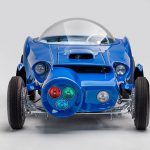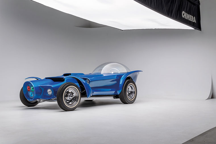 Diseñado por Ed Newton y construido en fibra de vidrio por Ed Roth, el Orbitron representa a la perfección la estética de la “era espacial” de la década de 1960, con su diseño asimétrico, tapa de burbuja y televisión integrada. Construido con luces separadas de rojo, verde y azul (RGB), el faro está diseñado para producir un solo haz blanco cuando se mezcla, como el televisor, conectando elementos interiores y exteriores.