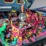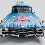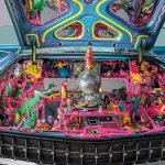 Kenny Scharf es un artista bi-costero, sus trabajos altamente experimentales, envolventes y a menudo presentan íconos de la cultura pop, personajes de dibujos animados y escenas futuristas representadas en aceites similares al aerógrafo o en un conjunto pintado en el día. El New Improved Ultima Suprema Deluxa se basa en un Cadillac Eldorado de 1959 y presenta criaturas antropomorfas que flotan entre los símbolos culturales de la era espacial.
