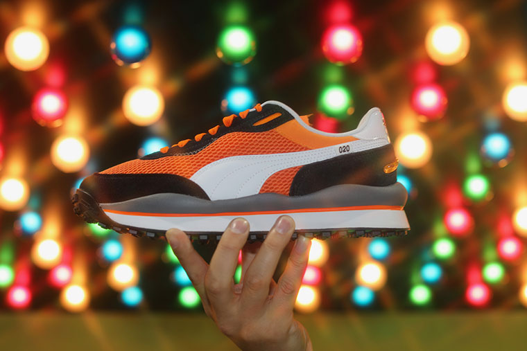Primer plano de la Puma Fast Rider ComplexCon remix y el techo de luces.
