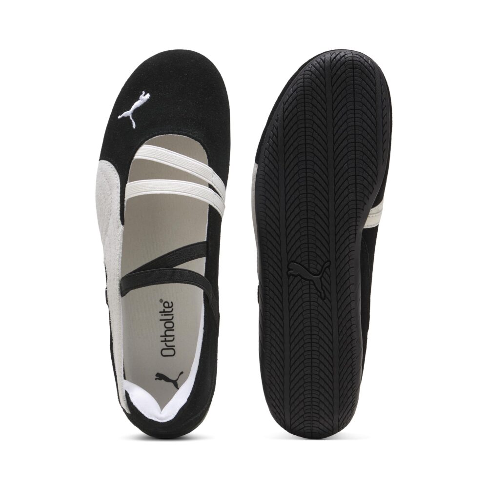 dando como resultado en un calzado que une gracia y potencia. Inspiradas tanto en el mundo del ballet como en el del automovilismo, las Speedcat Ballerina se destacan por su parte delantera abierta, su tira elástica de sujeción y su silueta elegante que remite a las tradicionales ballerinas.