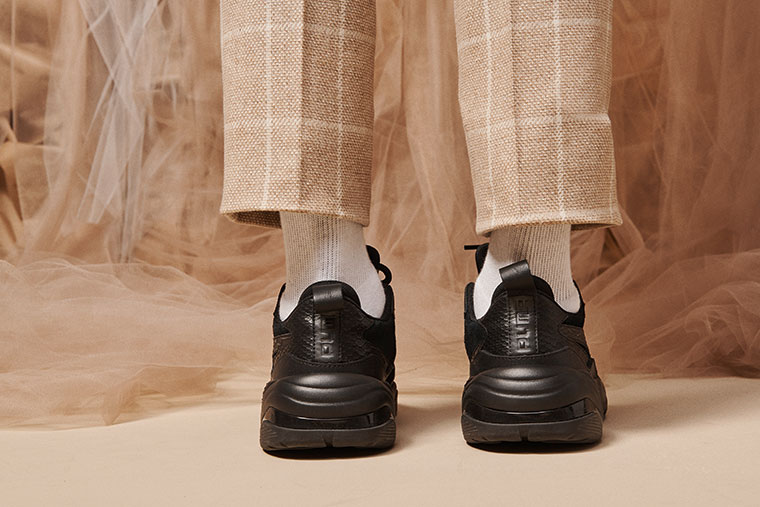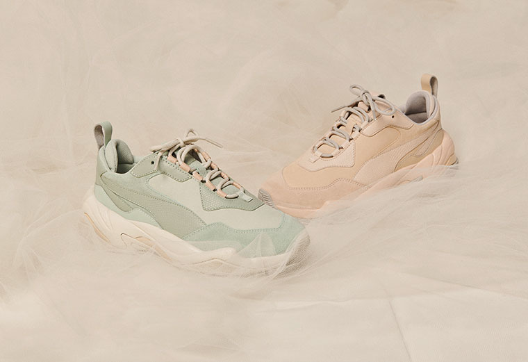 Mientras que el debut de Thunder Spectra adquirió un carácter atrevido con su bloqueo de color retro y sus toques de neón, el modelo para mujeres de Thunder Desert presenta una apariencia tenue con una combinación de colores que imita los tonos del desierto al atardecer. Mantiene la firma exagerada de herramientas, proporciones infladas y mezcla de materiales de gamuza premium, cuero texturado y malla.