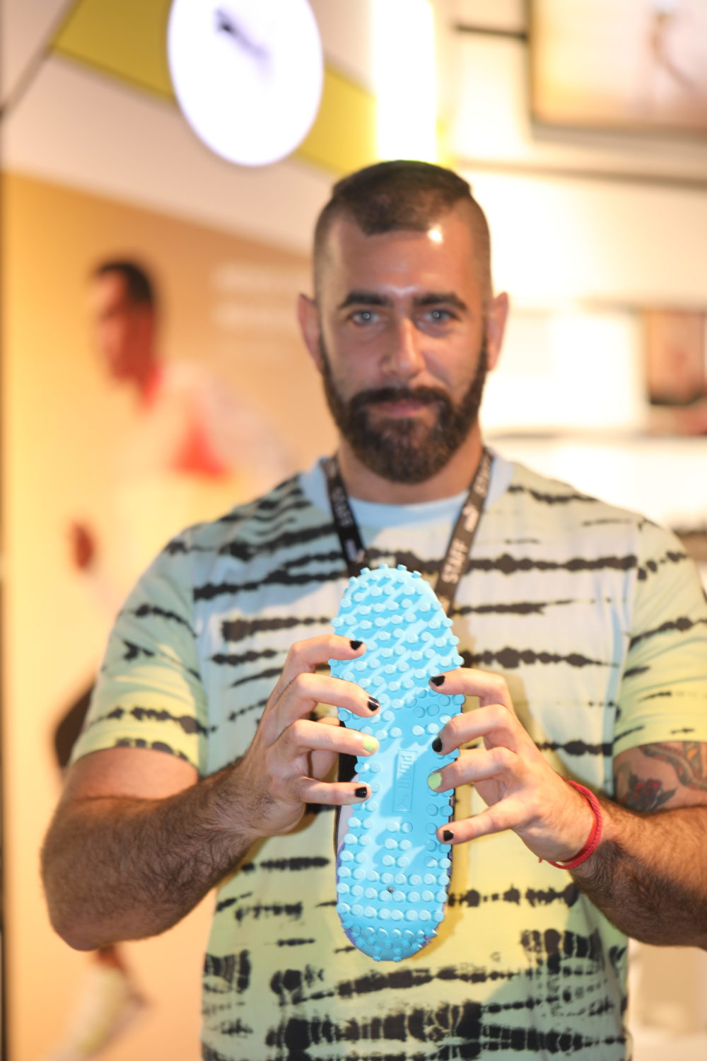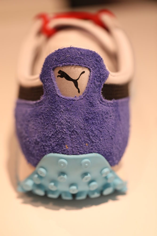 Pepe de Puma mostrando la suela de las Puma con los icónicos Federbein originales de Fast Ride que son esos piquitos