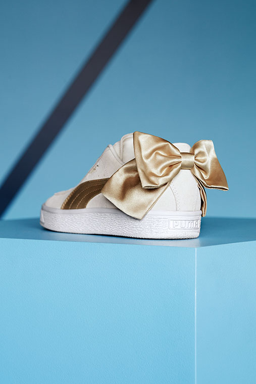 Suede Bow es un calzado de streetstyle que se caracteriza por su dulzura y sus detalles. Su silueta es la icónica zapatilla de gamuza de PUMA mezclada con hermosos detalles y un lazo de satén exagerado en el talón y cordones de cinta. Suede Bow Varsity es una edición renovada con una elegante actualización metálica. Este nuevo modelo es blanco y peacoat en gamuza superior premium, con una tira de oro metálico satinado que fluye en un arco unido al talón.