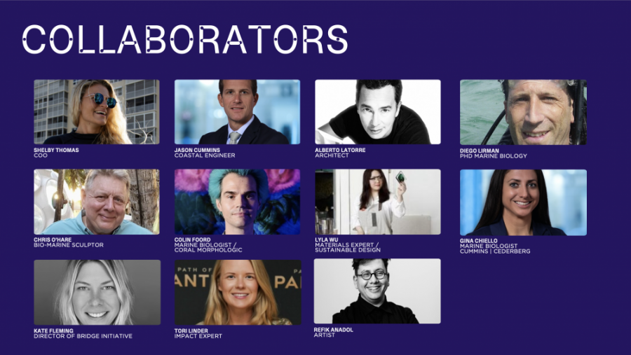 Algunos de los colaboradores del proyecto ReefLine que incluye : biólogos marinos, expertos en impacto ambiental, arquitectos, escultóres biomarinos, Ingenieros costeros, artistas y curadores.