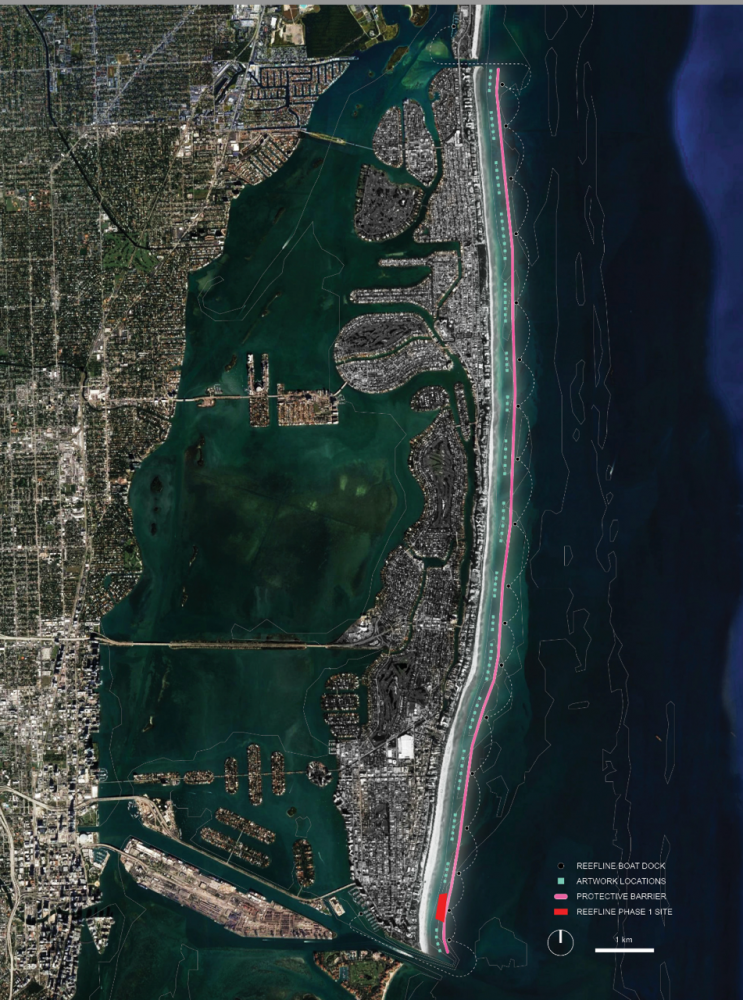 Ubicado a 15-20 pies de agua y a una distancia nadable de la costa, ReefLine contará con obras de arte ambientalmente funcionales, incorporando materiales patentados (CarbonXinc, Coral Lok) que actuarán como arrecifes de coral híbridos y ofrecerán a la comunidad una oportunidad gratuita de interactuar directamente con la biodiversidad marina de Miami y el arte público submarino.