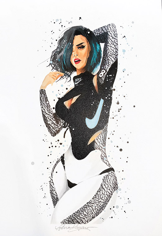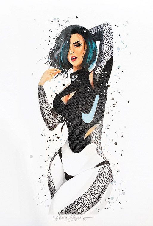 Reina Koyano nos dijo, primero, que su nombre es real y elegido por sus padres. No es un apodo. Luego nos explicó que su sistema de trabajo es partir de un modelo de zapatillas y se lo imagina puesto en uno de sus personajes. “El diseño de las zapatillas tienen muchas historias, así que tengo muchas cosas para dibujar. Las deconstruyo y creo nuevos conceptos en mis ilustraciones”, admitió. También comenzó a hacer esculturas basadas en sus trabajos. Nosotros elegimos su ilustración de una pseudo Katy Perry vestida con un catsuit muy futurista inspirado por las Nike Air Max 1 diseñadas por Koji de Atmos Japon que mezclan a la perfección el print de piel de elefante con el color blanco y swoosh turqueza.