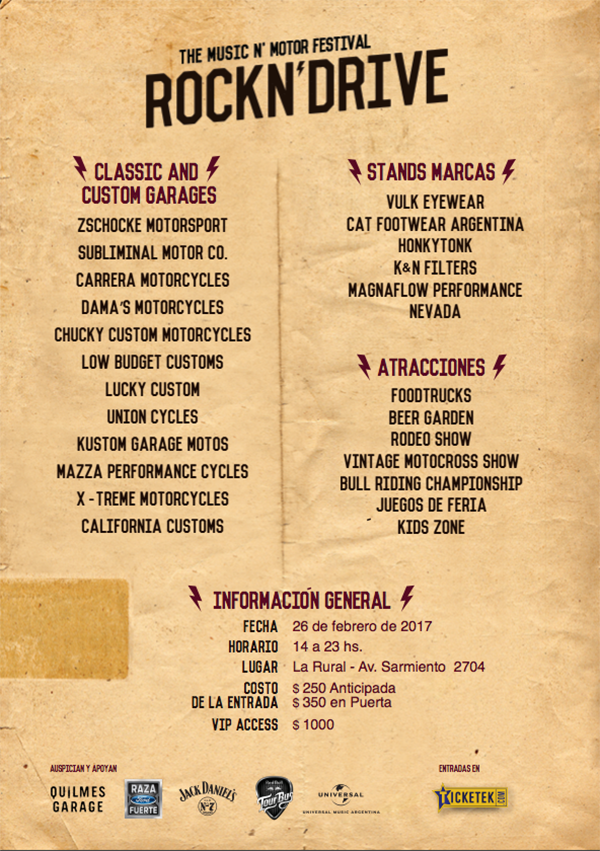 Rock N’ Drive es una comunidad de apasionados de las motos, los autos y el rock. La propuesta del festival consiste en reunir a los fanáticos de los fierros motorizados, la música y los tatuajes en un mismo lugar. Se presentarán bandas en vivo y expondrán sus trabajos los mejores talleres de customización de motos y autos. Contaremos con el famoso campeonato de toro mecánico y la elección de Mr. and Miss Rock N’ Drive. También contaremos de una gran variedad de foodtrucks con diferentes propuestas gastronómicas. Esta nueva edición de RN’D promete una producción sorprendente nunca antes vista!