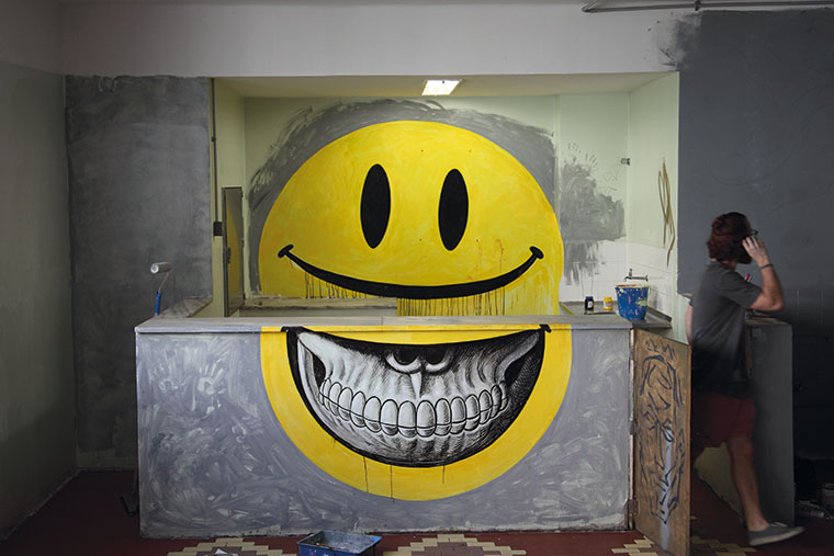 Según sus propios cálculos ha realizado por lo menos 5.000 obras de arte con el “Smile” y socorronamente dice que parará de hacer su ya mítico mueca cuando llegue al millón de sonrisas.