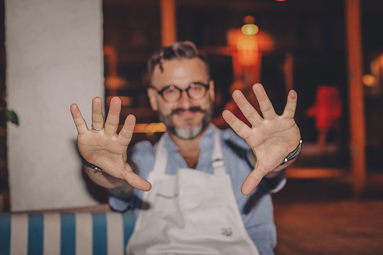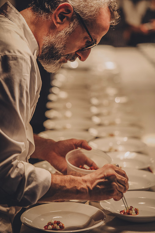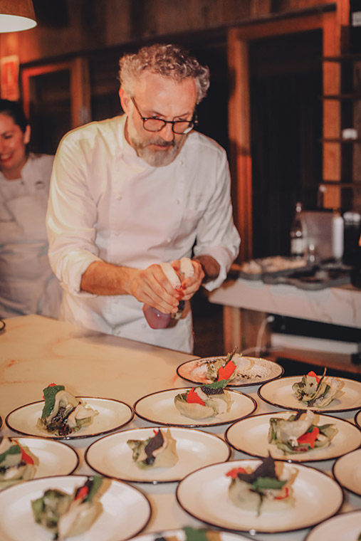 Massimo Bottura condimentando la Insalata di Mare, colocando aceto balsámico di Modena y aceite de oliva.