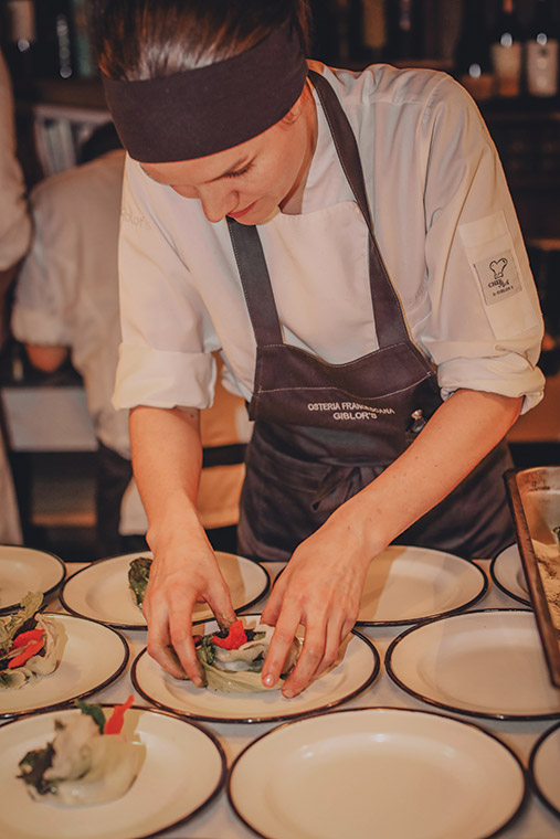 La Chef Jeniffer de Osteria Francescana realizando la Insalata di mare.