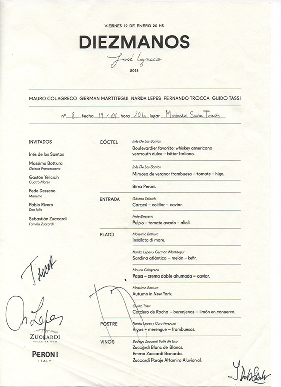 Menú autografiado por los Cocineros Bottura, Trocca, Narda Lepes y Mauro Colagreco.