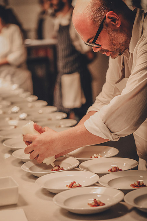Massimo Bottura condimentando la Insalata di Mare, colocando aceto balsámico di Modena y aceite de oliva.