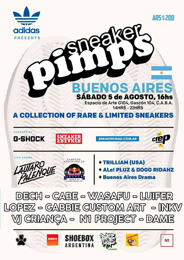 Sneaker Pimps, la gira más grande de sneakers llega a Buenos Aires, este Sábado 5 de Agosto. Presented by adidas Originals, G Shock Argentina, Crep Protect Argentina – Uruguay, Sneakerhead Argentina. 16hrs – 22hrs en Gascón 104.
