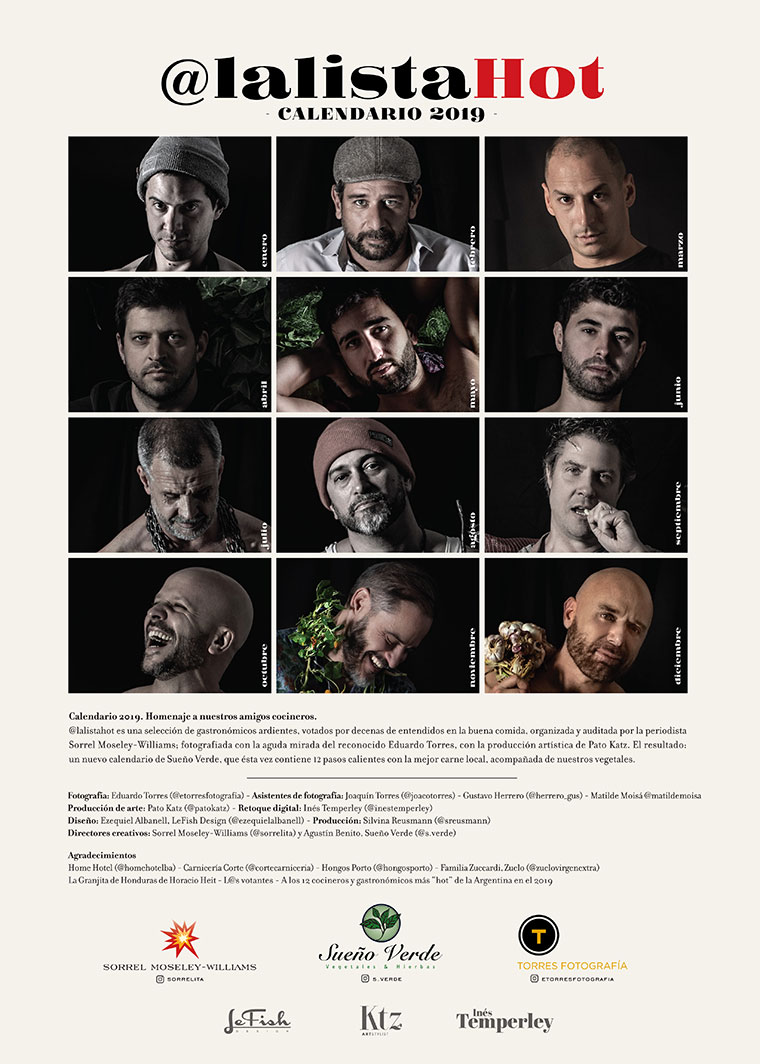 Los 12 chefs fueron elegidos luego de una extensa y meticulosa votación organizada por la periodista Sorrel Moseley-Williams, de la que participaron decenas de fanáticos de la buena comida. Bautizada como << @lalistahot – cocineros >> esta selección de gastronómicos ardientes fueron fotografiados en todo su esplendor bajo la aguda mirada del reconocido Eduardo Torres, con la producción artística de la directora de arte Pato Katz.