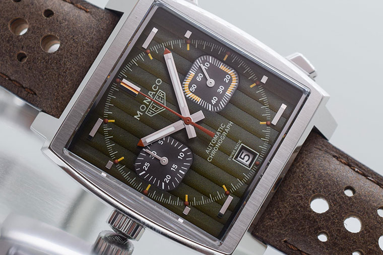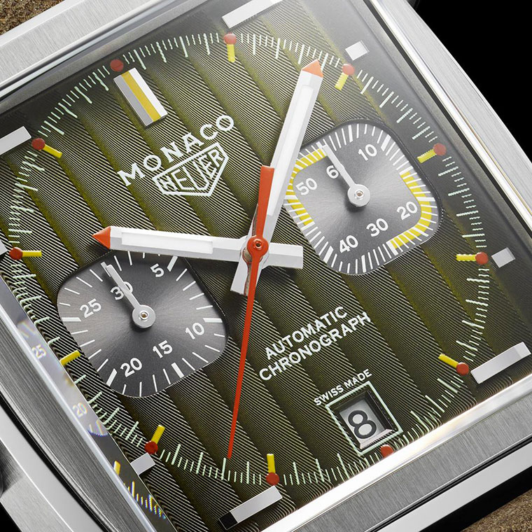 Este nuevo modelo de acero inoxidable, que cuenta con una correa de piel marrón, con perforaciones en color marrón claro, está disponible en una edición limitada de 169 piezas. La carátula verde cuenta con detalles en marrón y amarillo y acabado en Côtes de Genève. Las agujas están revestidas con SuperLuminova®. Basta con observar las subesferas y la posición de la corona para reconocer la herencia poco convencional del reloj Mónaco original.
