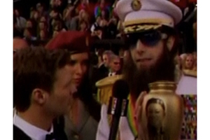 El extravagante Sacha Baron Cohen -también conocido por sus personajes Borat & Bruno– irrumpió en los premios Oscar personificando a un Dictador que lleva consigo las cenizas de su difunto amigo y que, en un acto de total sorpresa y en vivo, derramó sobre el elegante Burberry de Ryan Seacrest de E!. No te lo pierdas!!!
