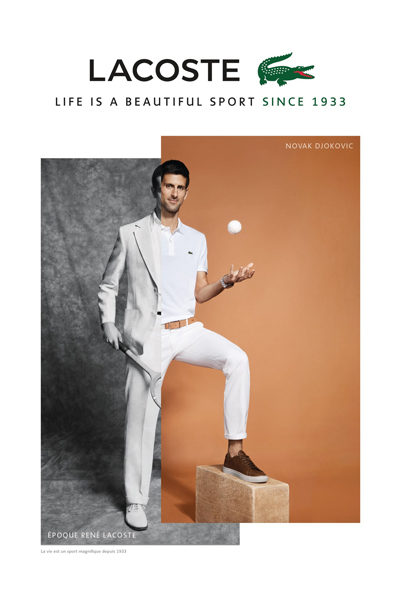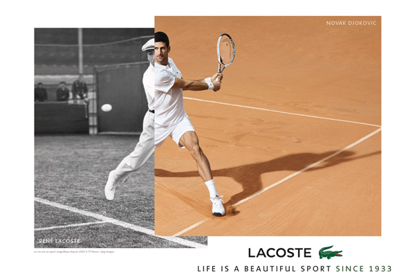 Para su nueva campaña publicitaria, la marca imaginó un intercambio entre los dos campeones, René Lacoste y Novak Djokovic. El film, dirigido por Julien Pujol, da testimonio del momento decisivo de la marca: la invención de la polo LACOSTE L.12.12 – el día en que René Lacoste decidió romper con los códigos de vestimenta de tenis contemporáneos acortando las mangas de su camisa con el fin de permitir una mayor libertad de movimiento.