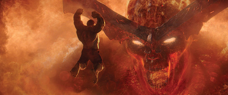 Hulk (Mark Ruffalo) enfrentándose a Surtur, un demonio de fuego nativo del plano extradimensional de Muspelheim, tierra de los demonios de fuego y uno de los nueve mundos de la mitología nórdica.