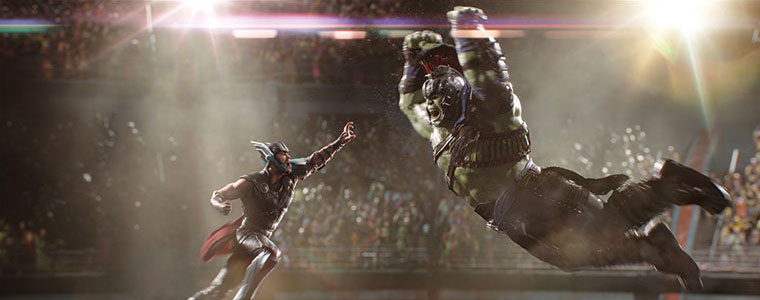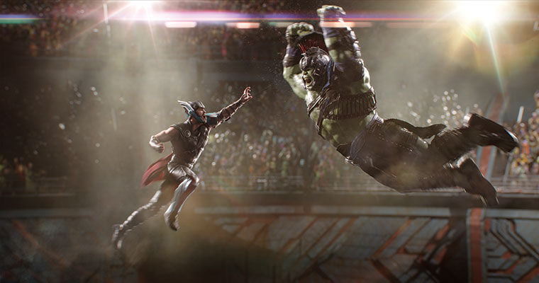 Thor (Chris Hemsworth) enfrentando a Hulk (Mark Ruffalo). En la mitología nórdica, Ragnarok significa “hacia el fin del universo”, así que cabe suponer que cierta acción estremecedora y vertiginosa podría mantener en vilo a Thor junto al científico Bruce Banner/Hulk y al público de THOR- RAGNAROK.
