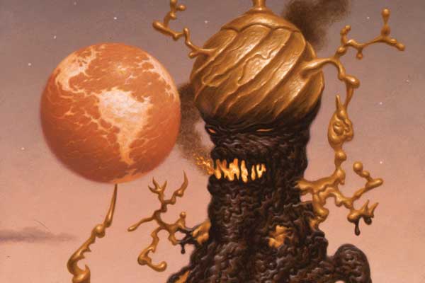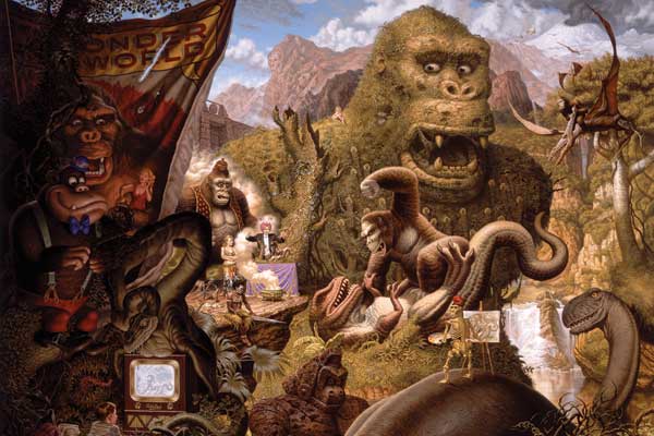 Usualmente, me toma un mes preparar el dibujo para un lienzo grandote como “Ape Worship”. Hace poco, estuve haciendo un estudio de color que me ayuda a a visualizar el esquema que estoy buscando. Una vez que aumento el dibujo y lo paso a lienzo, puede tomarme un mes, ¡o nueve! Depende siempre del tamaño y la complejidad. “Ape Worship”, por ejemplo, me tomó un año desde el boceto inicial hasta la pintura terminada, y diseñar el marco ornamental gigante.