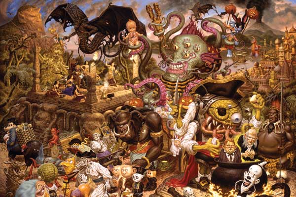 ¡Totalmente! Al mismo tiempo, tenías la amenaza constante de la guerra nuclear que te pendía sobre la cabeza, lo que me produjo mucha ansiedad. Cada semana, había un test público de alarmas de ataques aéreos, y una vez por mes, el famoso “duck and cover”, donde teníamos que escondernos debajo del pupitre en caso de que cayera la bomba. La imágen de fantasia que disfrutaba de la tele y los comics, combinado con mi sentido exacerbado de la ansiedad con respecto al mundo real que me rodeaba, formaron mi primer sentido estético. Después, en la secundaria a fines de los ‘60s, me interesaron muy fuerte los posters de las fiestas psicodélicas que se hacían en San Francisco, y los comics underground, como Zap de Robert Crumb. Y en el verano de 1970, pude viajar a Europa. Parado frente a las pinturas de los maestros renacentistas en la galería Uffizi en Firenze tuve la idea de combinar mi amor por los cartoons y la cultura pop con las técnicas de los viejos maestros. Era una ambición que me iba a tomar muchos, muchos años.