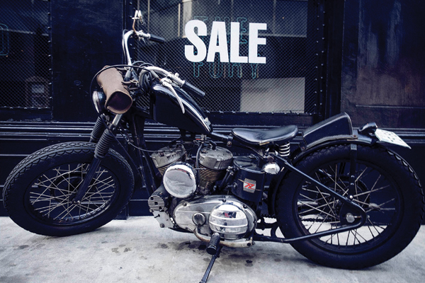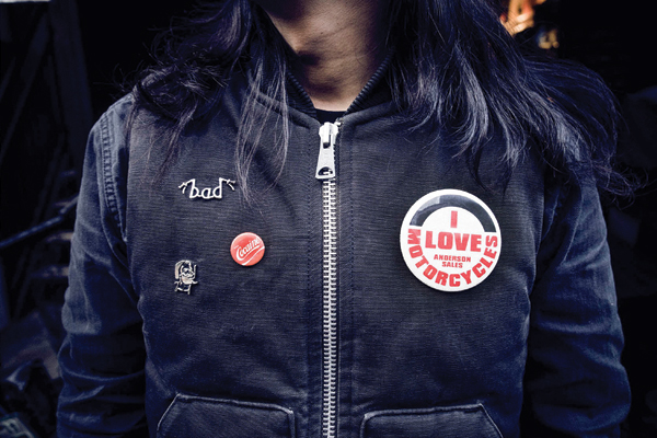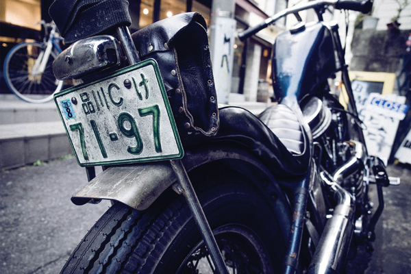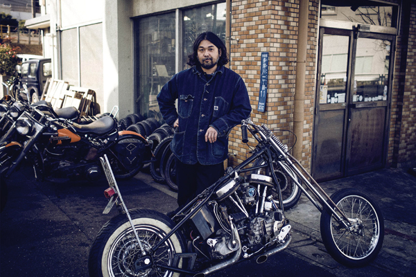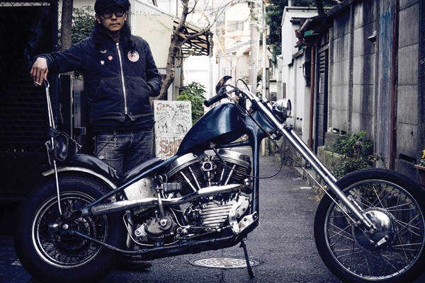 Aki y su Panhead 1950 enfrente a su local Bunkerstud, en el barrio de Harajuku