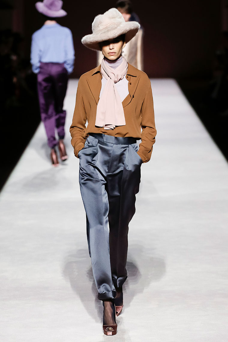 Si bien la temporada pasada fue decididamente femenina, esta temporada se trata más de sastrería y cierta juventud. En cuanto al estado de ánimo, hay una sensualidad lánguida y romántica en esta colección, pero también una cierta calidad de pavo real en el corte y los colores de los pantalones, y la nitidez de la sastrería. Los sombreros son un accesorio al que rara vez respondo, pero esta temporada me encanta el romance de fedoras de piel falsa con amplios bordes para las mujeres y una elegante gorra de cachemir bloqueada para los hombres. Los zapatos de plataforma en ricos tonos polvorientos de satén, terciopelo y cristal a menudo agregan otra posibilidad para una mezcla de color irreverente y anclan la silueta. El calzado de hombre es hecho a mano y clásico en su estilo y proporción. Hay una relación directa tanto de color como de humor esta temporada en la moda masculina y femenina, ya que las prendas inspiradas por los hombres son importantes en la colección de las mujeres y la suavidad en el color y el corte a menudo son importantes en la colección de los hombres. Ambas colecciones están unificadas en color, humor y cierto romance. Estas son ropas para sentirse seguro.