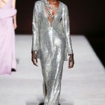 Las gafas también captan esta sensación romántica cuando los marcos transparentes de gran tamaño en el más pálido de los colores envuelven suavemente la cara. Las lentes de gradiente cálido dan a los ojos un tipo de drama y misterio. Debido a la apariencia reducida de la colección, la joyería se mantiene al mínimo. Las bufandas de seda y terciopelo envuelven los cuellos y permiten otra capa de color y las bufandas de malla metálica proporcionan un destello metálico. La bolsa más nueva de la temporada está envuelta en cadenas de oro, plata y rutenio. El maquillaje es sensual. Los ojos están bordeados en suaves y cálidos metales que enfatizan la profundidad y la intensidad del humo. Los labios están desnudos y en tonos de fondo y se ven naturales y se pueden besar. La piel tiene un ligero brillo y se esculpe utilizando varios tonos de rubor en el propio tono de piel de los usuarios. El efecto general es fresco y sensual al mismo tiempo.