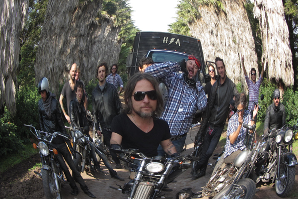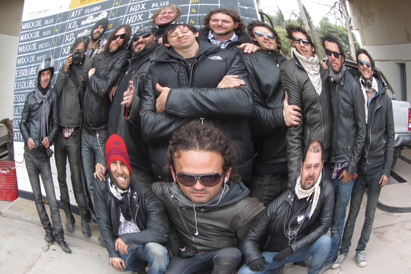 El grupo casi completo fotografiado por Tuti en alguna estación de servicio perdida en el camino. Por esas cosas de los efectos especiales, el Rana Pichot parece Schwarzeneger, y Bracuto parece el Ministro Manhattan Ruiz.