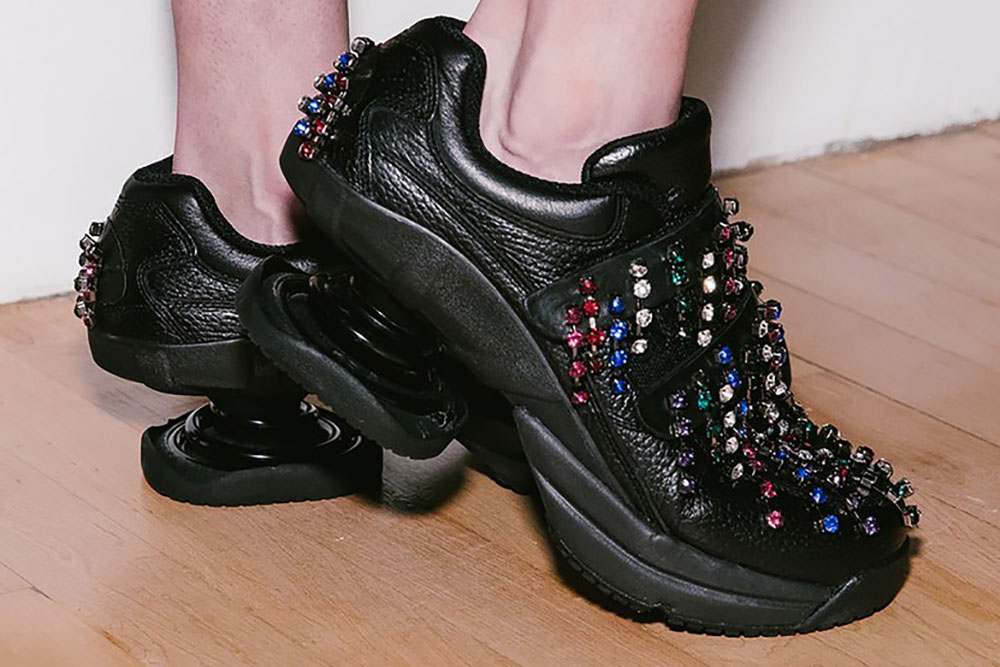 La moda de las «zapatillas feas» o «Ugly Sneakers» acaba de subir un escalón gracias al talento del diseñador inglés Christopher Kane que durante su desfile en el London Fashion Week mostró en los pies de sus modelos estas horripilantes zapas con un taco que asemeja un joystick retro con un resorte gigante y un cuerpo del calzado ortopédico con piedras de colores brillantes incrustadas. De gusto no hay nada escrito pero nos parece que se merece un premio a la zapatilla más fea del mes. Una pinturita!!!!!!!!!