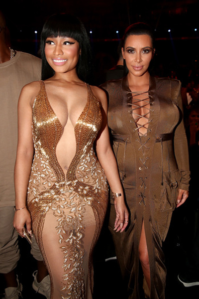 Nicki Minaj junto a la embarazaba Kim Kardashian que suscitó muchos comentarios y críticas por su cuerpo.